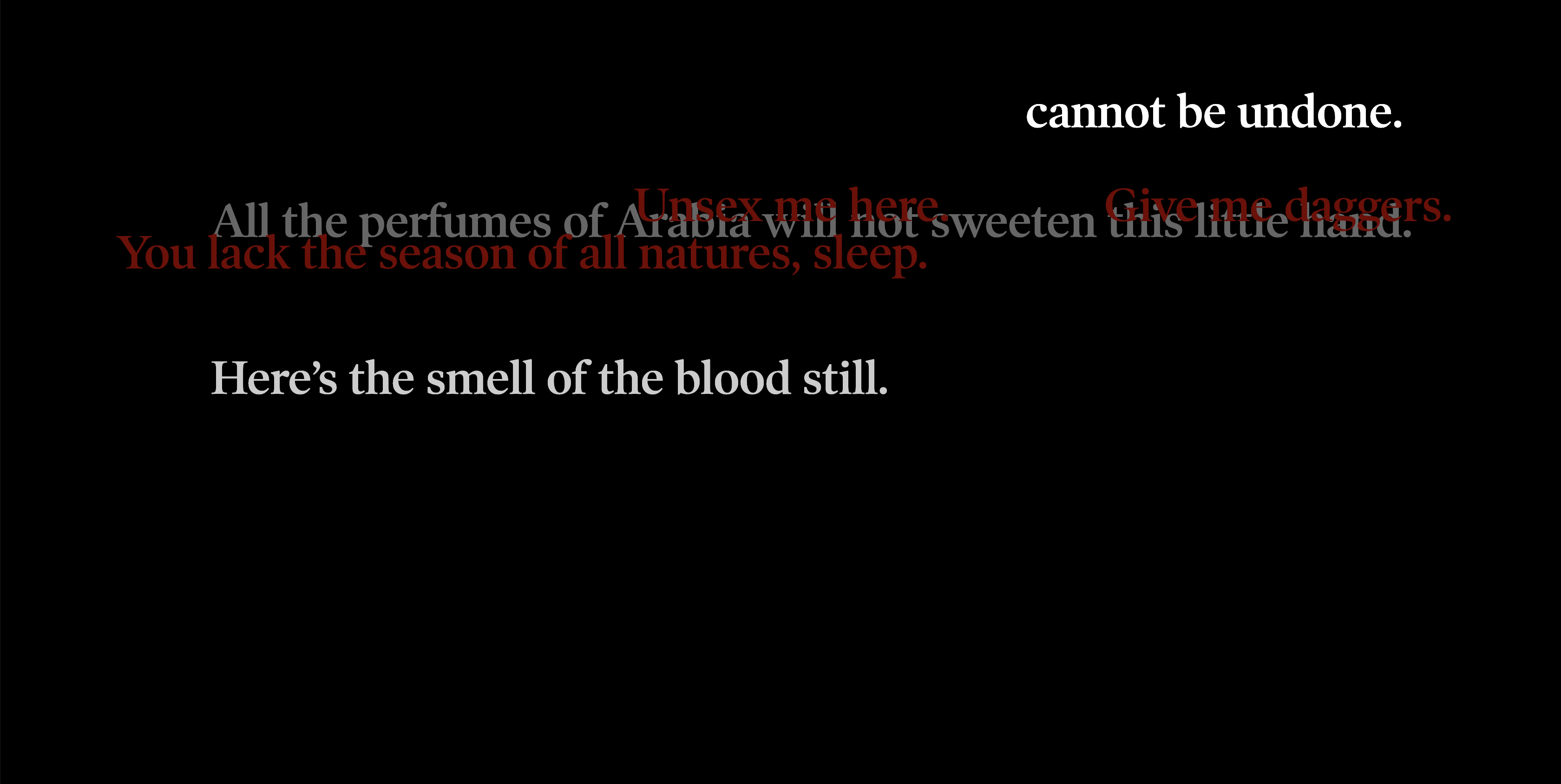 Maddie used animated visualizations and text to tell the story of the play "Macbeth" by William Shakespeare. The animated background creates a tension that is slowly developed in the play. The clicking of text helps to guide the audience to finish the tragic journey of play.